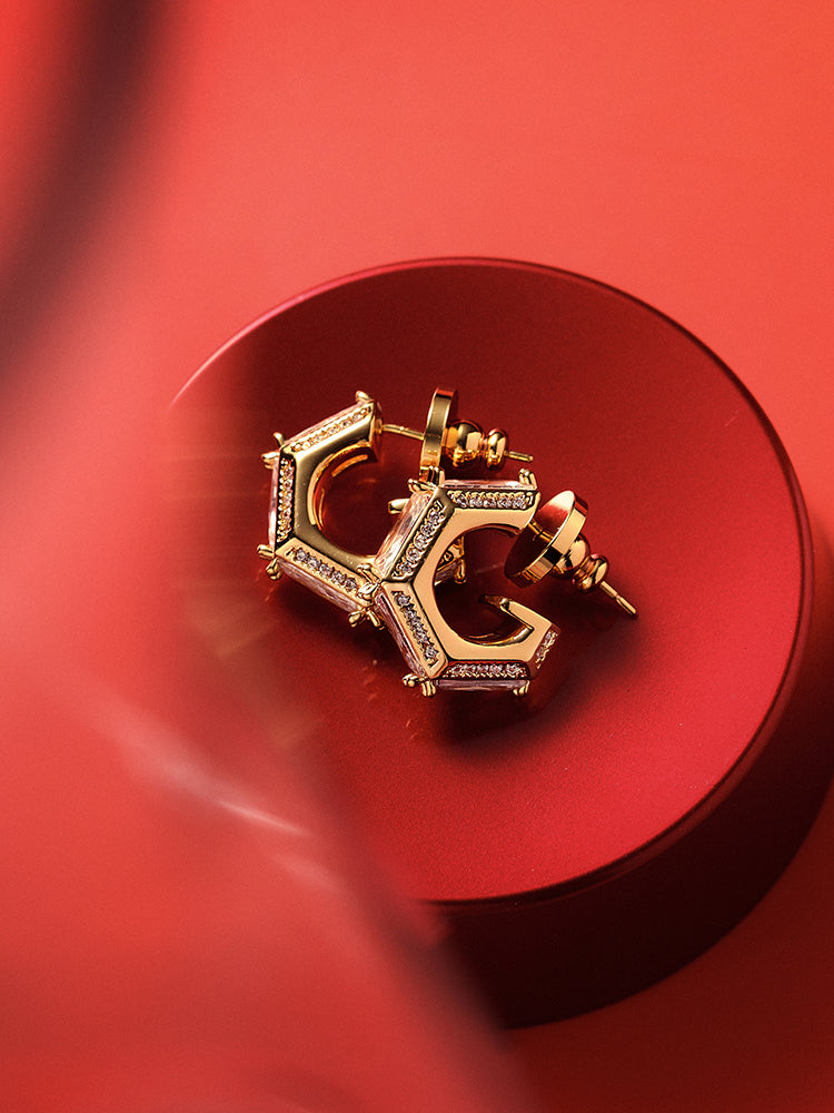 A bold yet refined design featuring a rectangular-cut zirconia mounted on a smooth C-shaped hoop. This striking contrast of angular gemstone and curved metal creates modern edge with timeless appeal.
