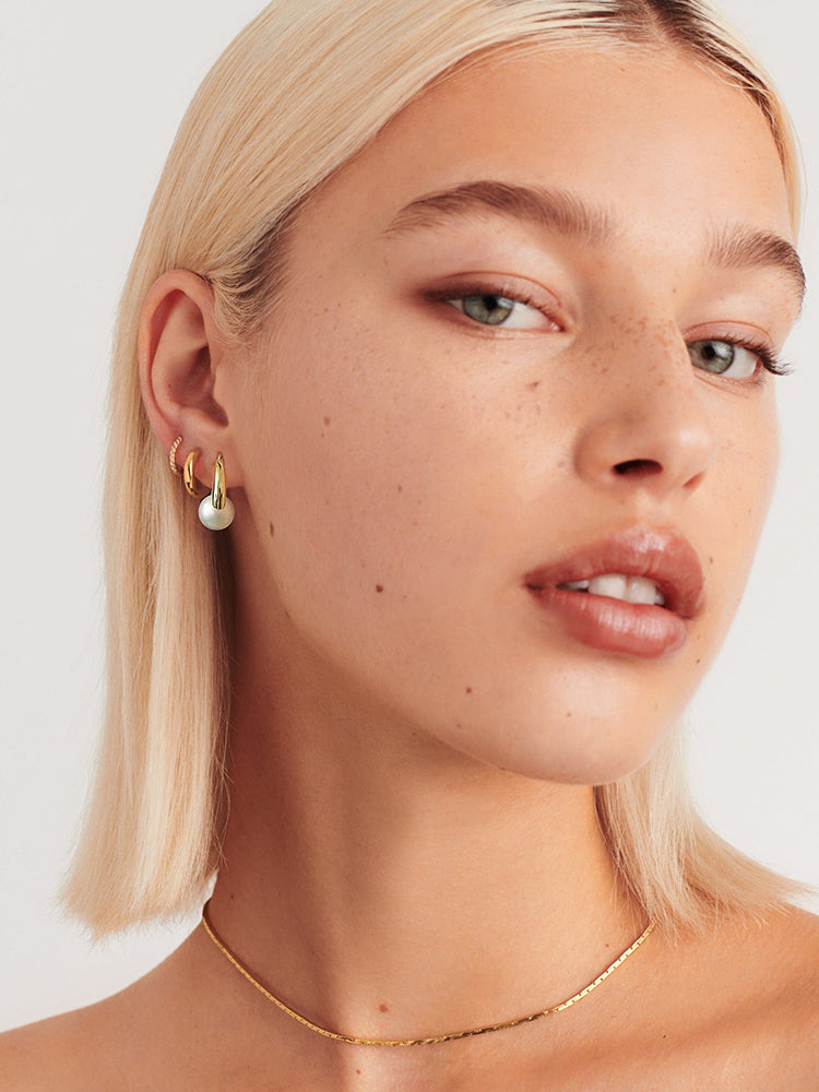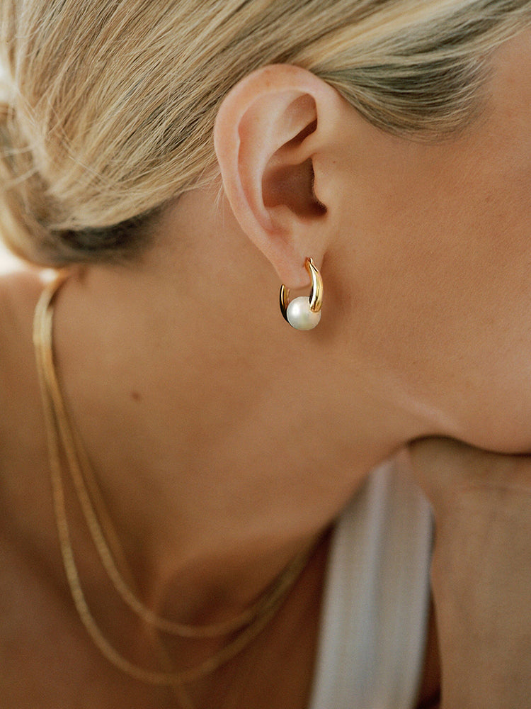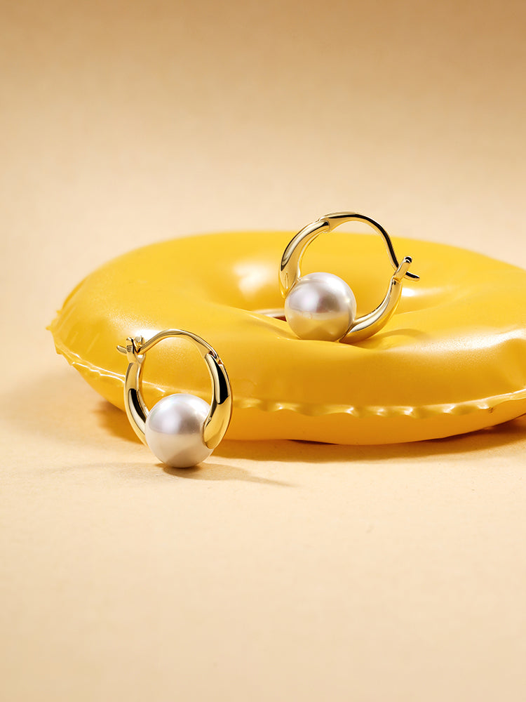 A modern twist on classic hoops, featuring a single lustrous pearl suspended at the center of a sleek gold circle. The perfect balance of minimalist structure and organic elegance.