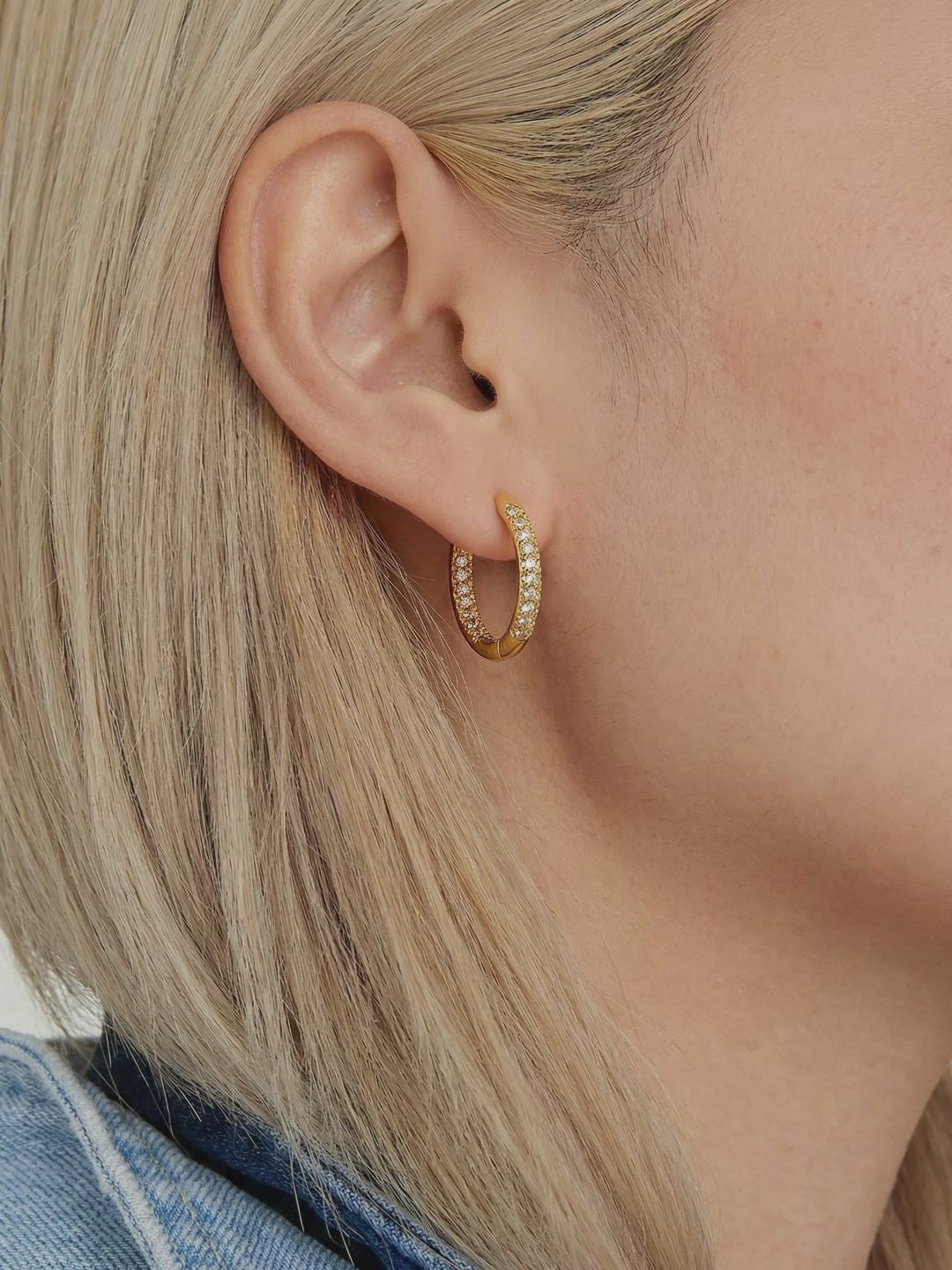 Timeless pavé huggies that add everyday sparkle. Crafted with thick 18k gold plating over recycled sterling silver for tarnish resistance and lasting shine. Hand-set cubic zirconia stones deliver brilliant light play from every angle.