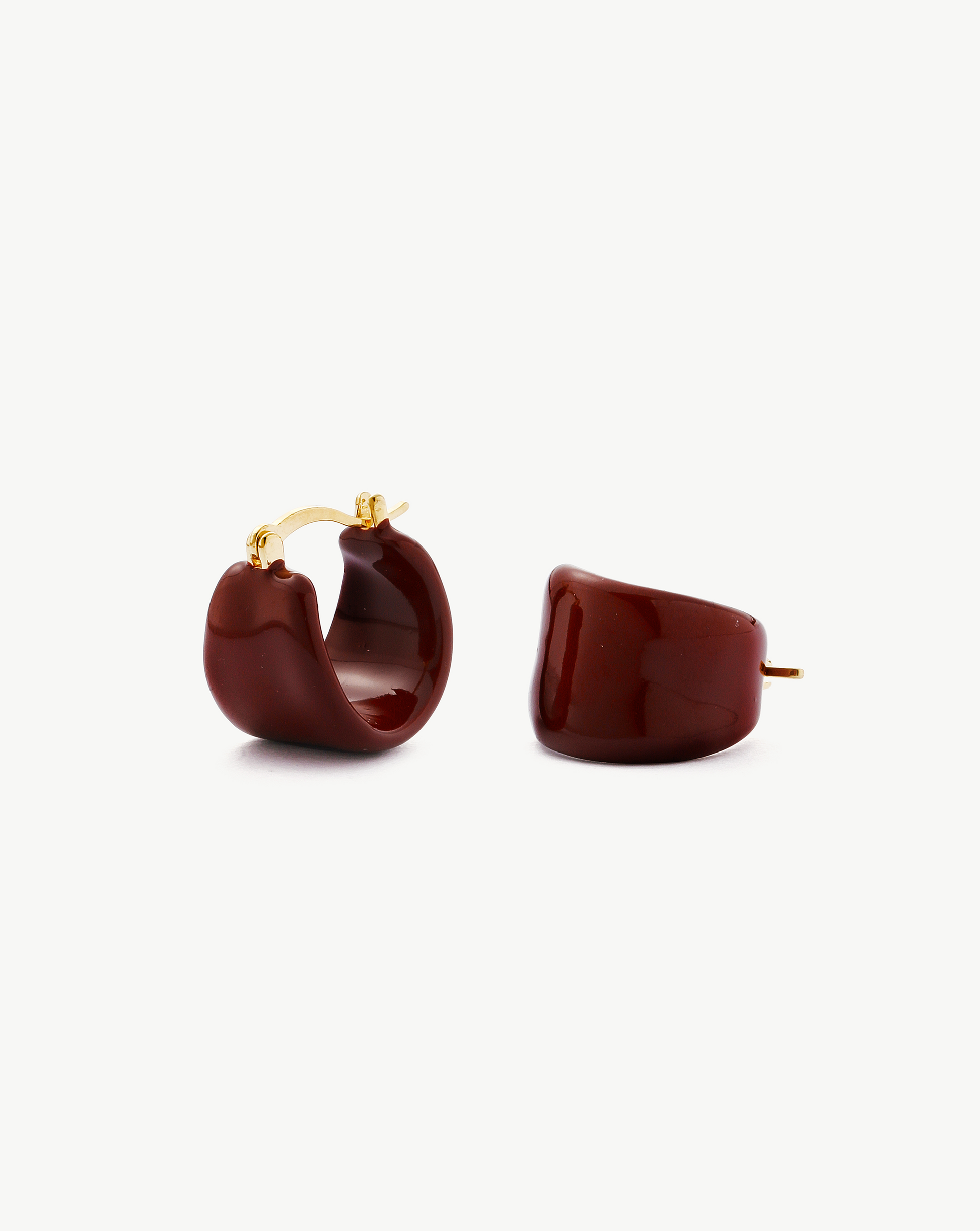 Rich, wine-red resin hoops with a plump, sculptural dome shape and subtle gold accents for bold everyday drama.These chunky huggies add instant warmth and sophistication, perfect solo or layered.Timeless depth with modern sculptural flair.