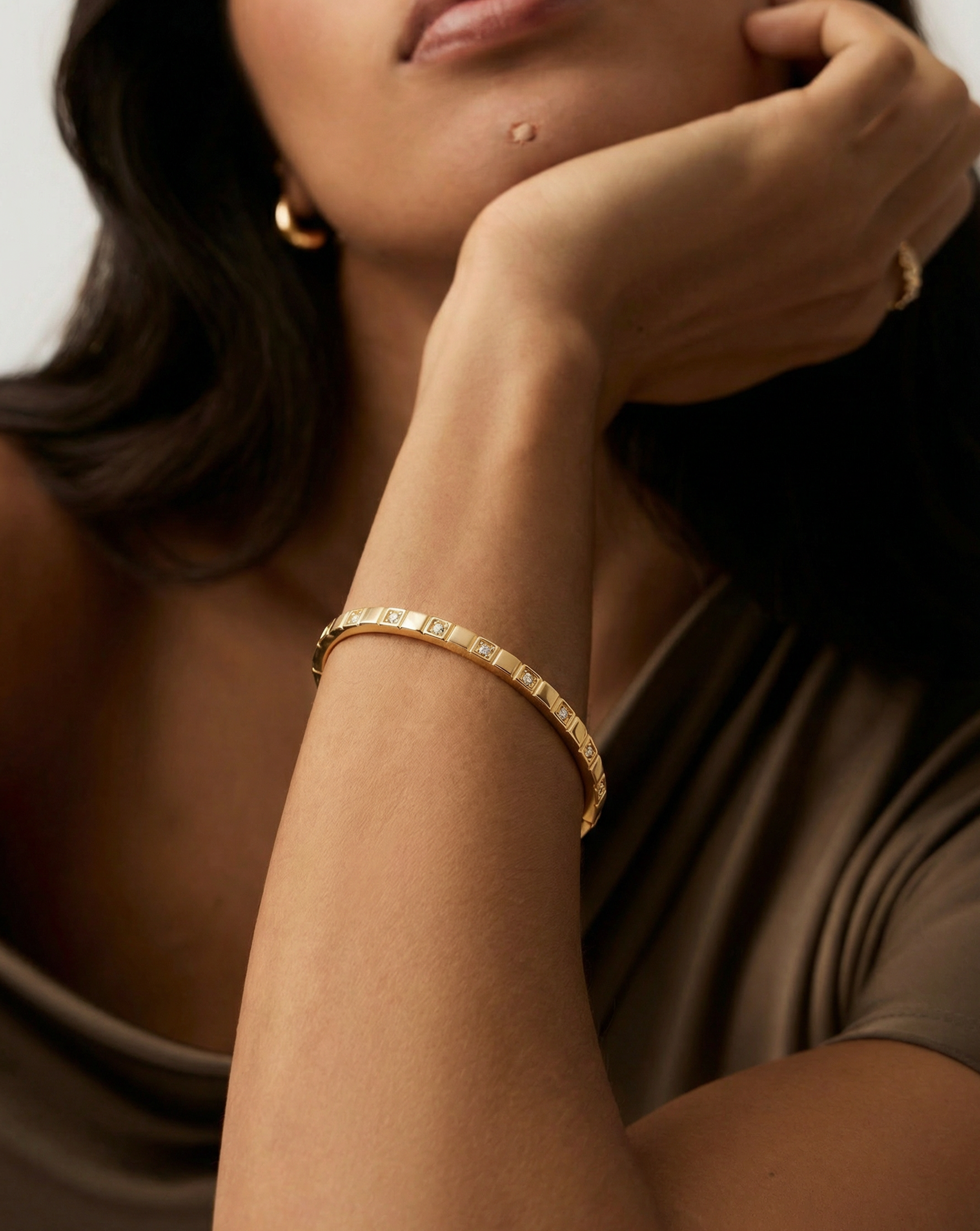 Sleek hinged bangle with geometric cube stations, each bezel-set with a sparkling cubic zirconia for subtle everyday glamour.Crafted in thick 18k gold plating over recycled sterling silver—tarnish-resistant, hypoallergenic, and lightweight for comfortable all-day wear.Timeless design that stacks beautifully or shines solo.