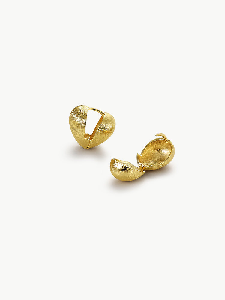 A clean take on heart earrings: rounded gold huggies finished with a subtle brushed texture. The design keeps it simple (no extra frills) — the matte, textured surface adds quiet depth to the classic heart shape, balancing soft warmth with sleek minimalism.