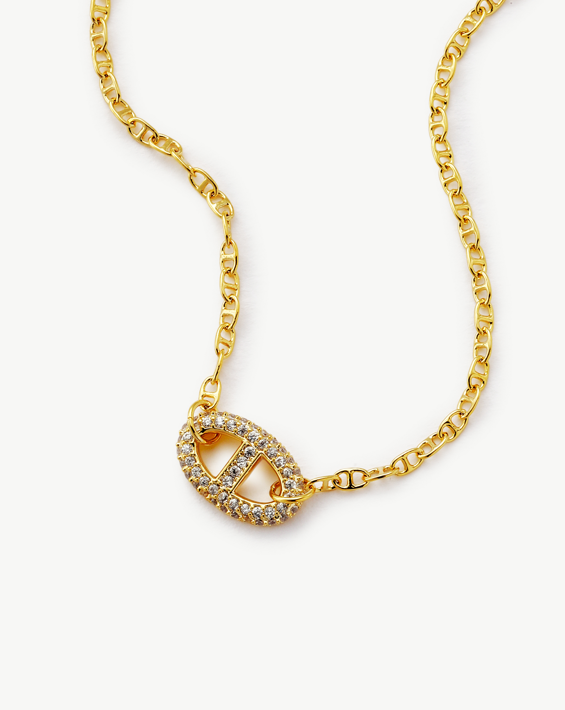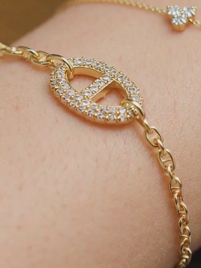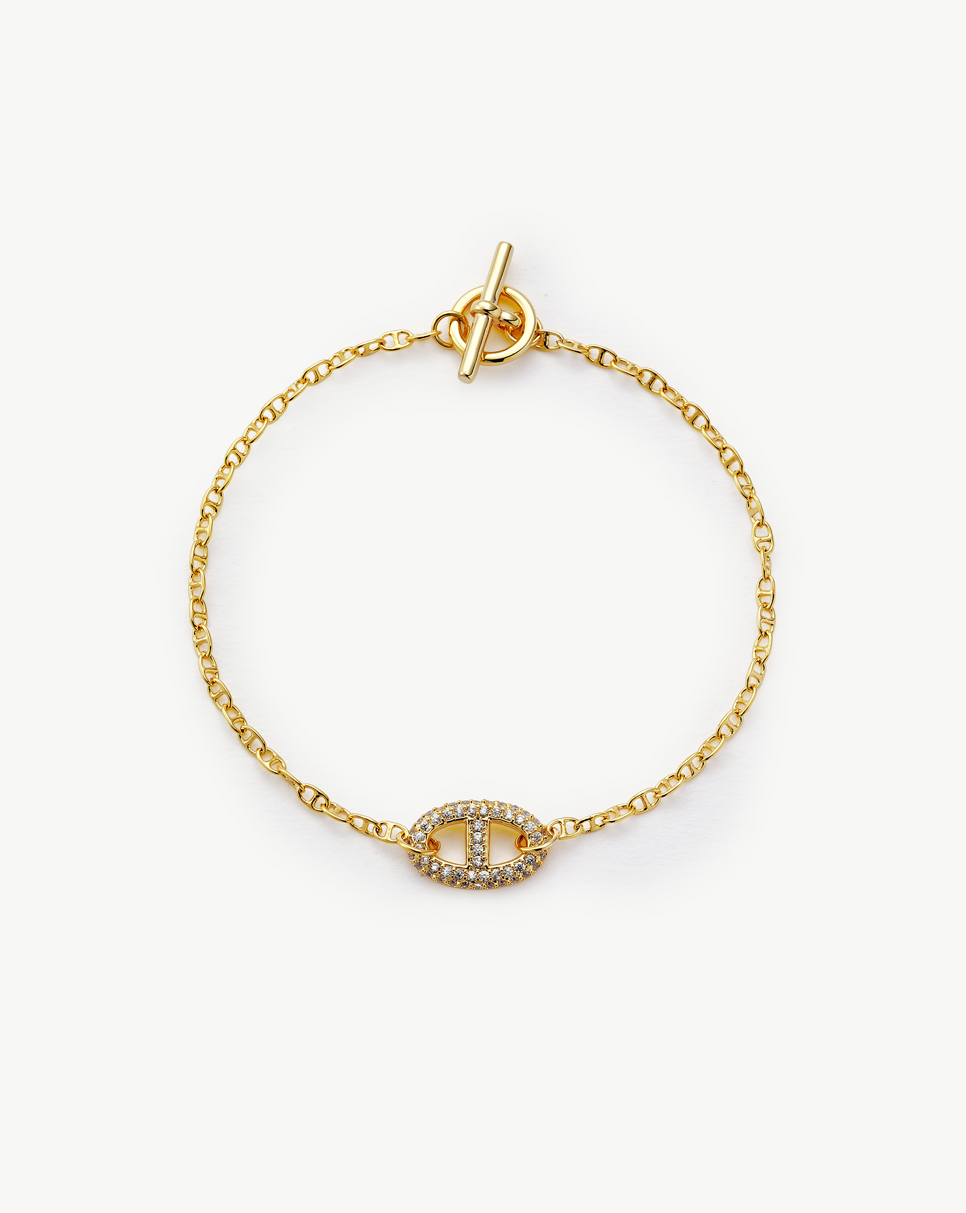 Bold mariner chain in 18k Gold Over Brass metal centered with a pavé oval motif and toggle clasp. Feminine nautical flair with brilliant sparkle—designed for stacking and adding instant glamour to any wrist.