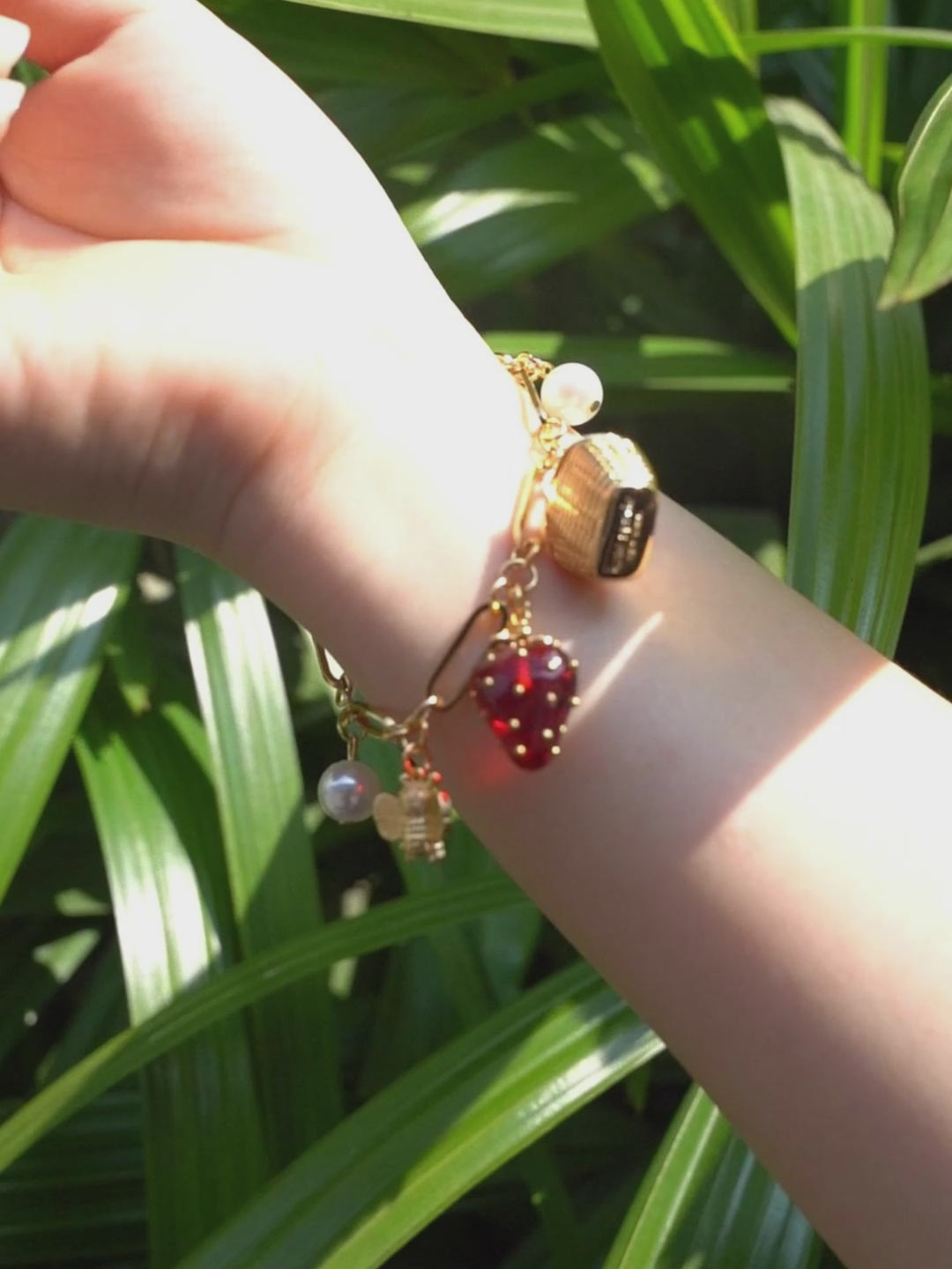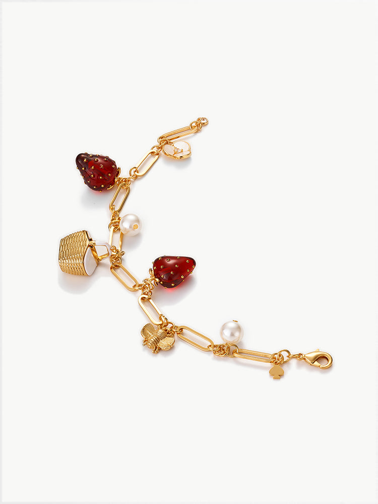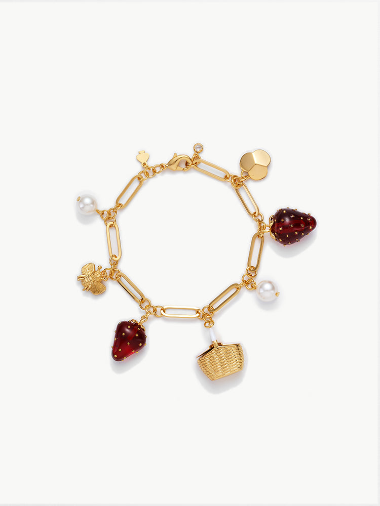 A best selling design to elevate your arm stack. Discover your new forever chain bracelet, classic paperclip chain you'll never want to take off (and never have to). Strawberry Pendant bring colour to this impactful bracelet, paired with a delicate chain. Wear solo or stack with more forever chains.