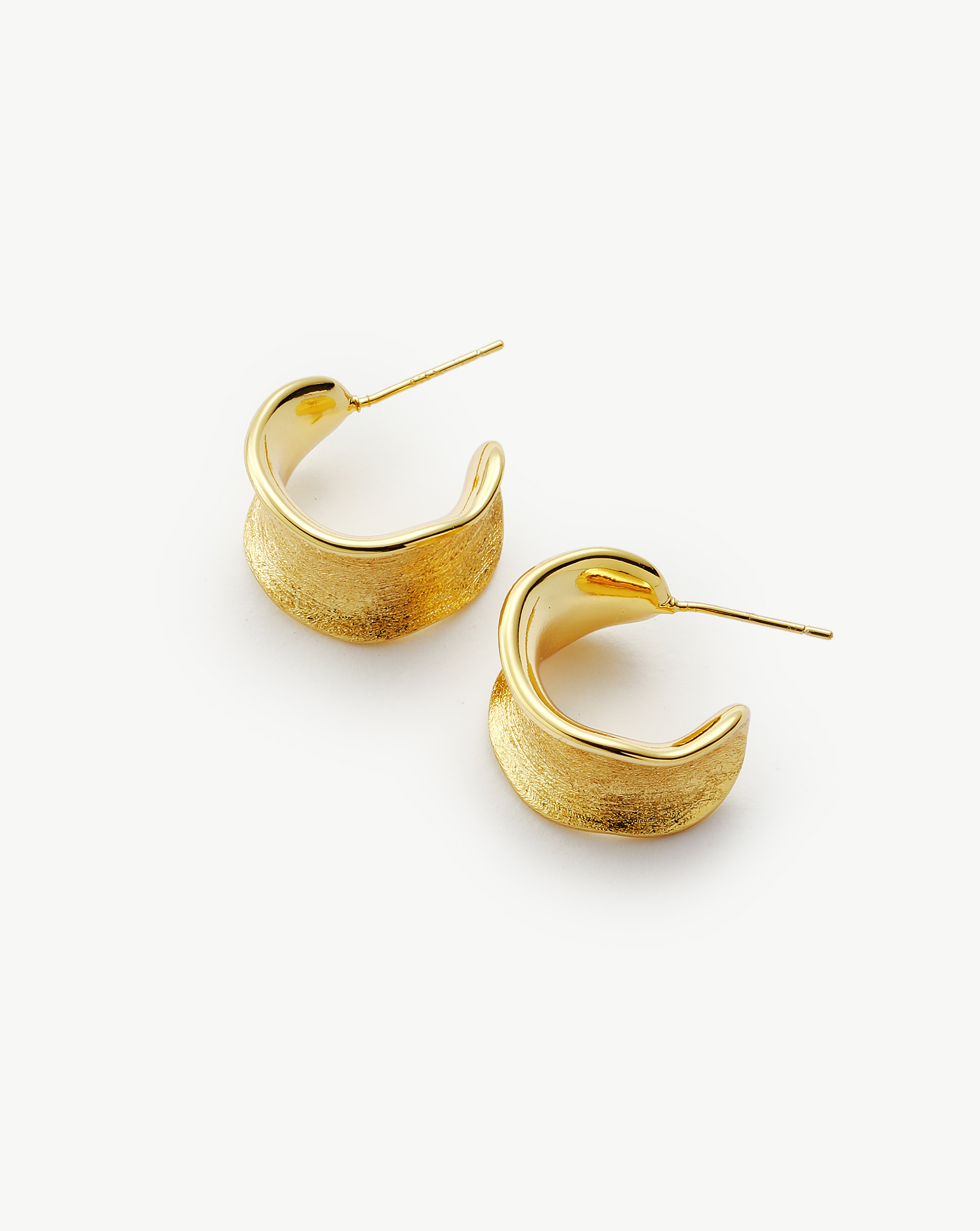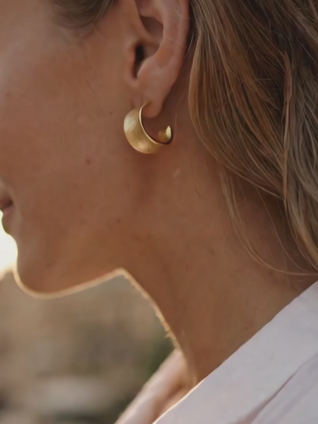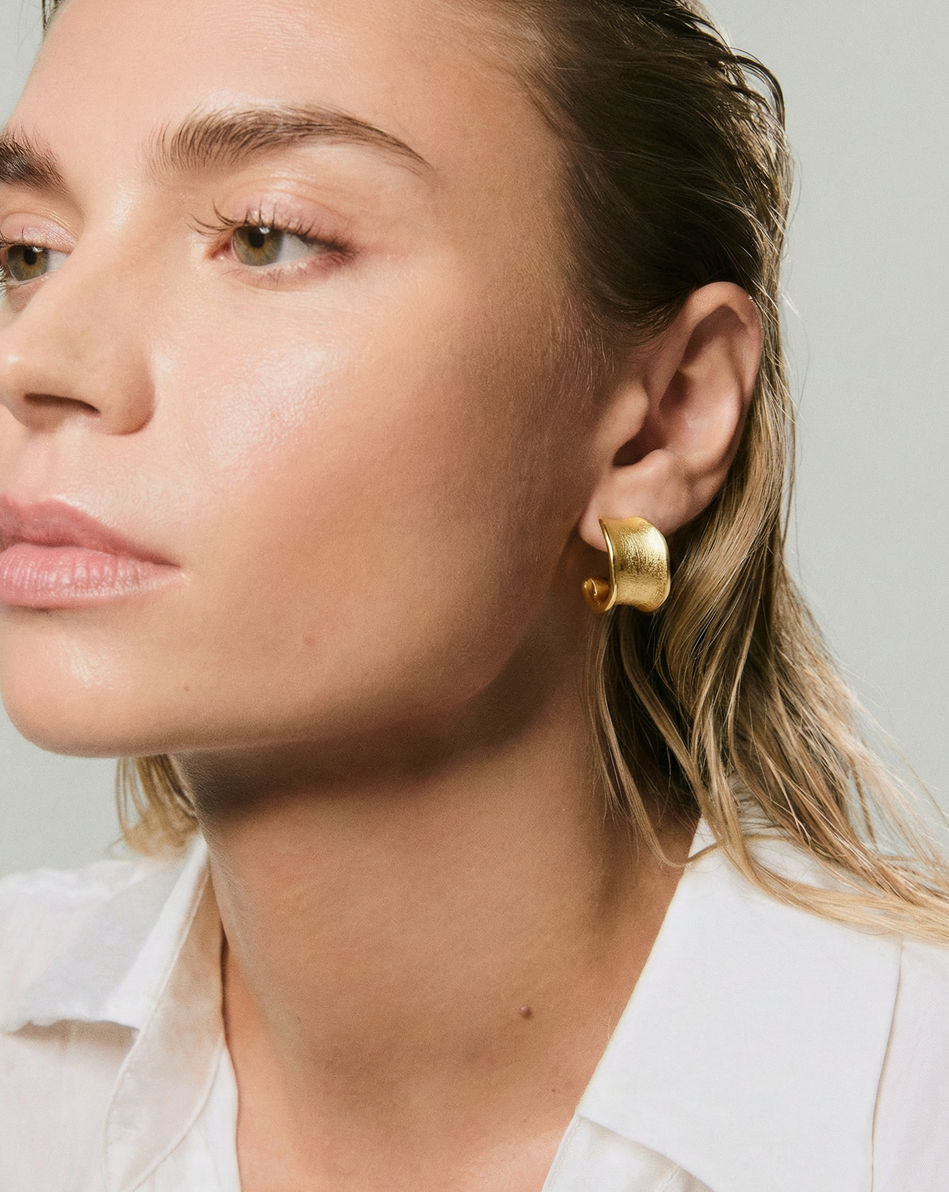 Golden hour, captured in an earring. These wide C-hoops feature a rich, matte gold finish that radiates warmth. The organic, wavy edges give them a relaxed, California-cool vibe. Lightweight enough for all-day wear, bold enough to make a statement.