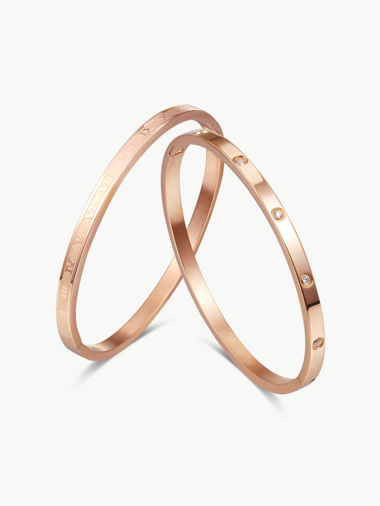 Sleek rose gold bangles dotted with subtle sparkles—one engraved, one polished. Stack them for understated luxury, or wear solo for quiet charm that fits every mood.