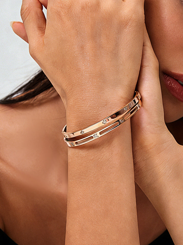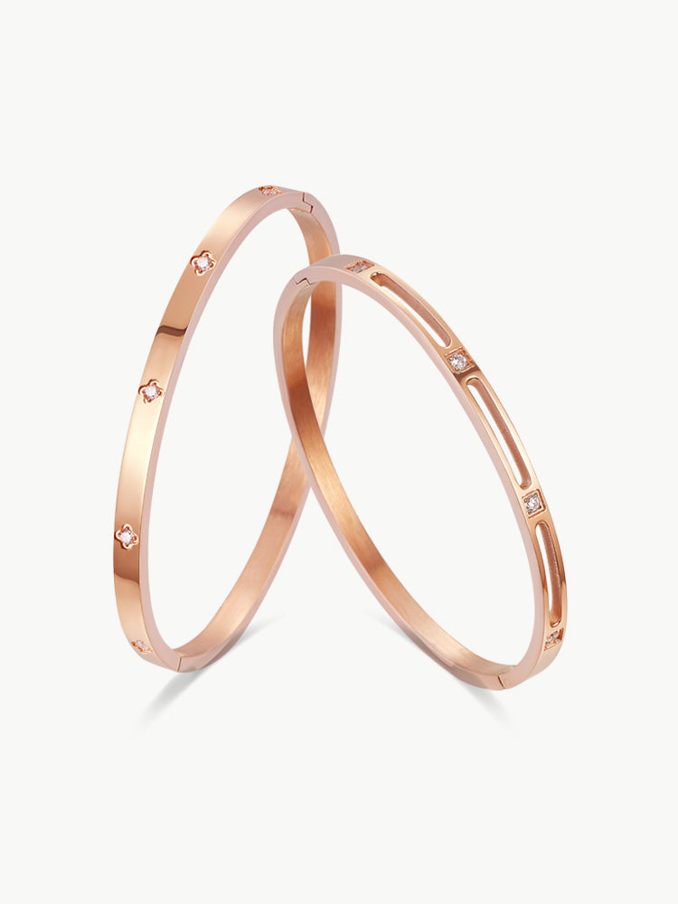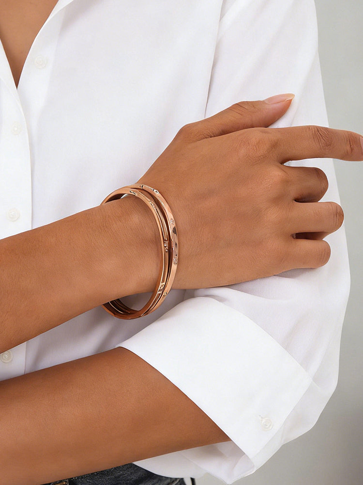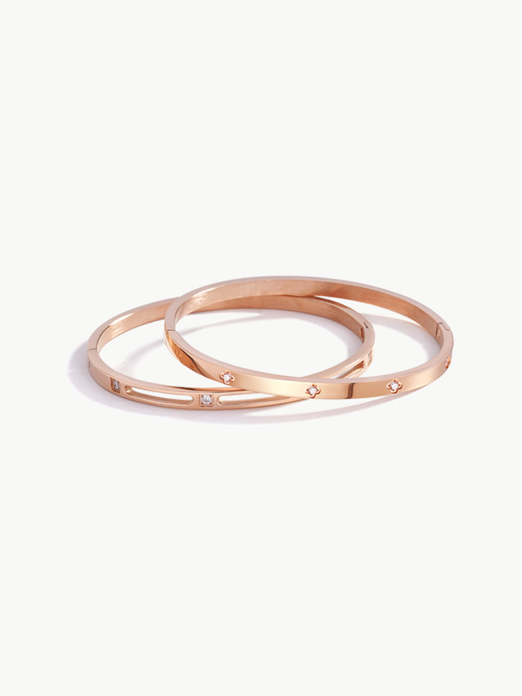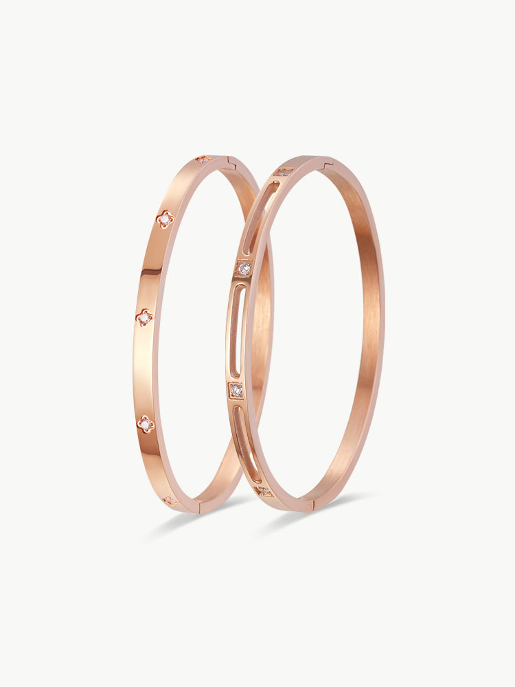 Two rose gold bangles—one dotted with star-shaped stones, the other with sleek sparkles. Stack all two together, balance out across both wrists, or wear solo: endless ways to style that turn everyday moments into little luxuries.